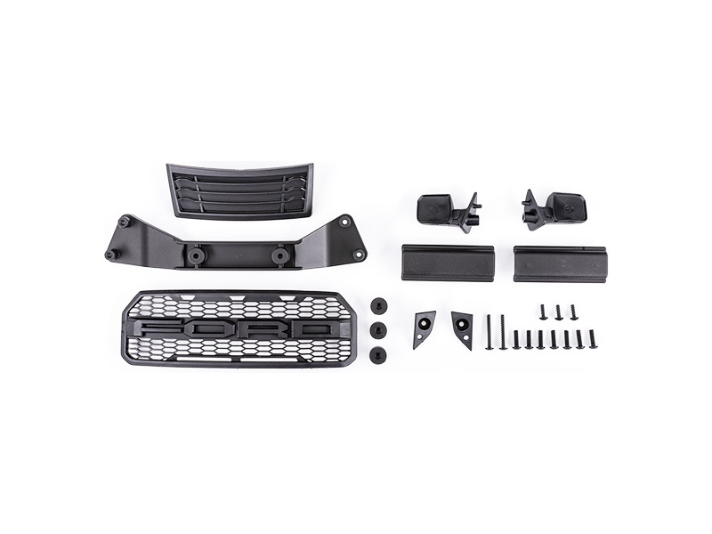 Náhradní díl pro RC modely aut Traxxas Ford® F-150® Raptor: maketové doplňky karosérie. Náhradní přední maska a boční zrcátka, držáky, adaptéry pro montáž, držáky západek a šrouby. (pro auto TRA58094-8-FOX)