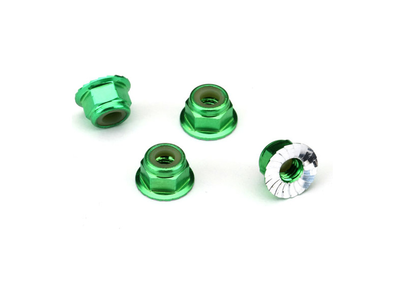 Samojistná matice M4 s drážkovaným límcem, materiál zeleně eloxovaný hliník. Balení obsahuje 4 ks.