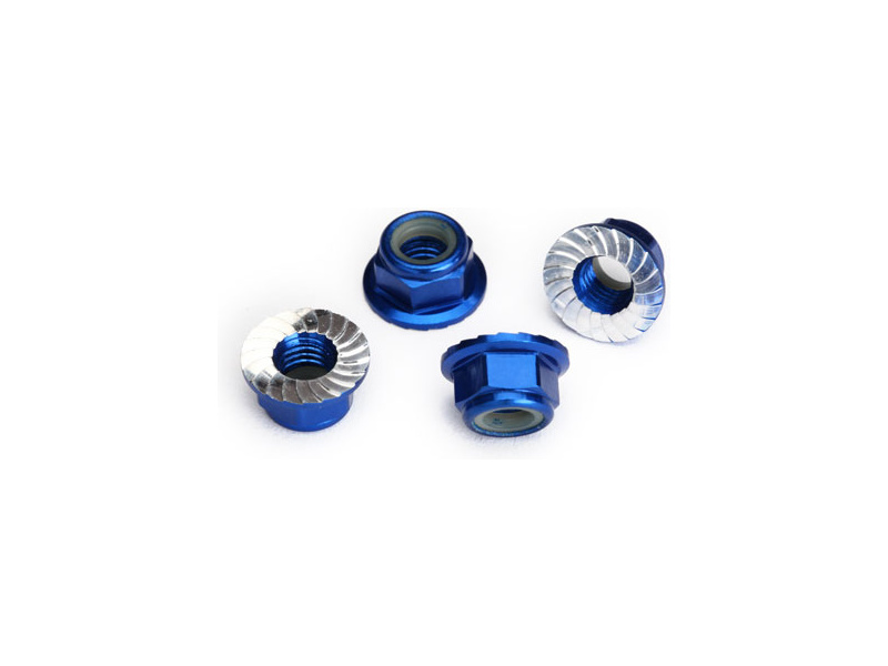 Náhradní díl pro RC modely aut 1:8 Traxxas Maxx, Desert Racer: Samojistná hliníková matice M5 s vroubkovaným límcem modře eloxovaná. Balení obsahuje 4 ks.