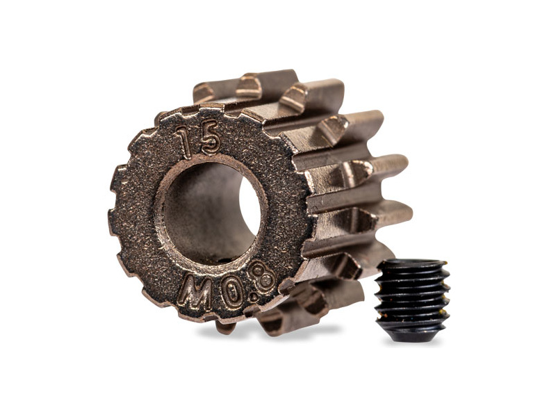 Traxxas pastorek na hřídel 5 mm s 15 zuby a modulem ozubení 32DP pro RC modely aut. Vyrobeno z sintrované oceli. Součástí balení je stavěcí šroub.