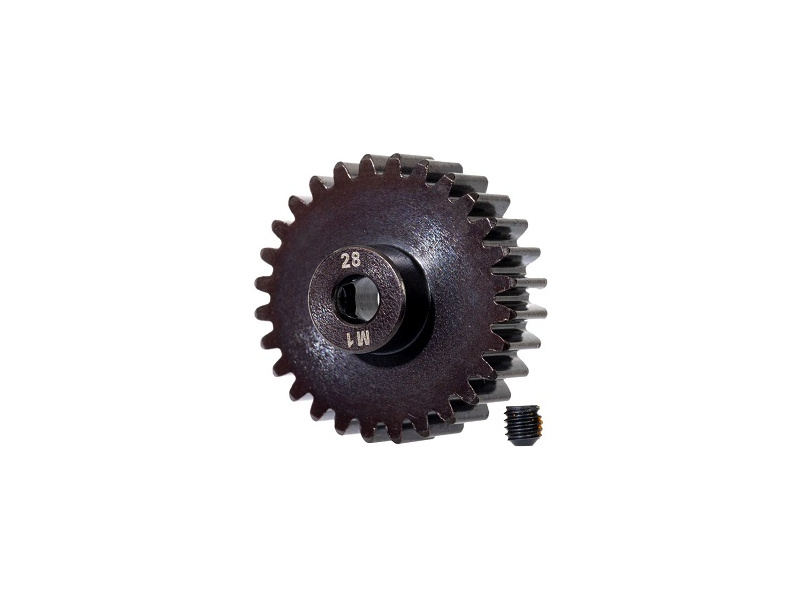 Traxxas pastorek na hřídel 5 mm s 28 zuby a modulem ozubení 1 mm pro RC modely aut. Vyrobeno z kalené oceli. Součástí balení je stavěcí šroub.