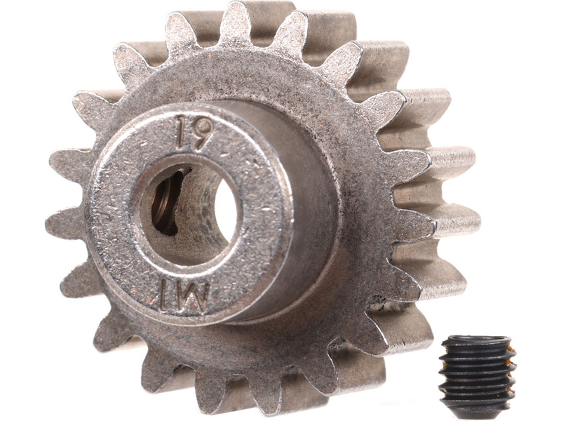 Traxxas pastorek na hřídel 5 mm s 19 zuby a modulem ozubení 1 mm pro RC modely aut. Vyrobeno z sintrované oceli. Součástí balení je stavěcí šroub.
