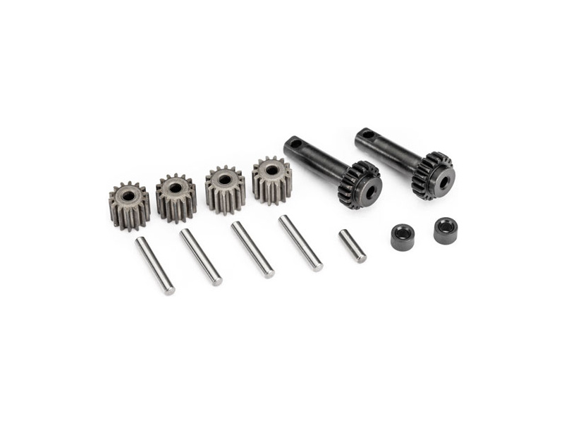 Náhradní díl pro RC modely aut Traxxas 1:12 Mini: planetová kola diferenciálu. Obsahuje výstupní převody (2), výstupní hřídel převodů (1), planetové převody (4), hřídele planetový převodů (4), vymezovače (2).