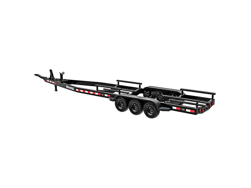 Přepravujte svůj člun Traxxas k vodě stylově s detailním třínápravovým přívěsem. Nastavitelné držáky podpěr na korbě se přizpůsobí klasickému trupu lodi Spartan nebo trupu katamaránu DCB-M41. Elastické úchyty bezpečně připoutají loď k lehkému hliníkovému rámu po celé délce přívěsu. Pomocí obsaženého výškově nastavitelného tažného zařízení můžete přívěs táhnout za RC modely aut Traxxas TRX-4 / TRX-6* (vč. High Trail) a Ford Raptor R. Můžete tak s lodí na přívěsu zacouvat přímo do vody.