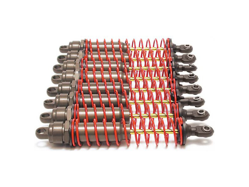 Olejové tlumiče Big Bore s pružinami o tuhosti #2.5. Hliníkové tělo s teflonovou vložkou, ocelové pístnice povlakovaná nitridem Titanu (TiN). Tlumiče jsou kompletně sestaveny včetně pružin #2.5 (červená), písty tlumiče a silikonový olej. Tuningový díl pro model T-Maxx.