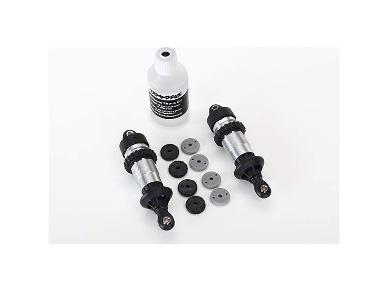Traxxas tlumič GTR hliníkový lesklý (2ks pření, 2ks zadní) se silikonovým olejem. Konstrukce GTR má hliníkové tělo se závitem a kroužkem pro přesné nastavení předpětí. Chromované hřídele mají vysokou životnost a hladký chod. Uvnitř tlumiče jsou tlumící pryžové tělesa, aby se zajistilo dokonalé tlumení.