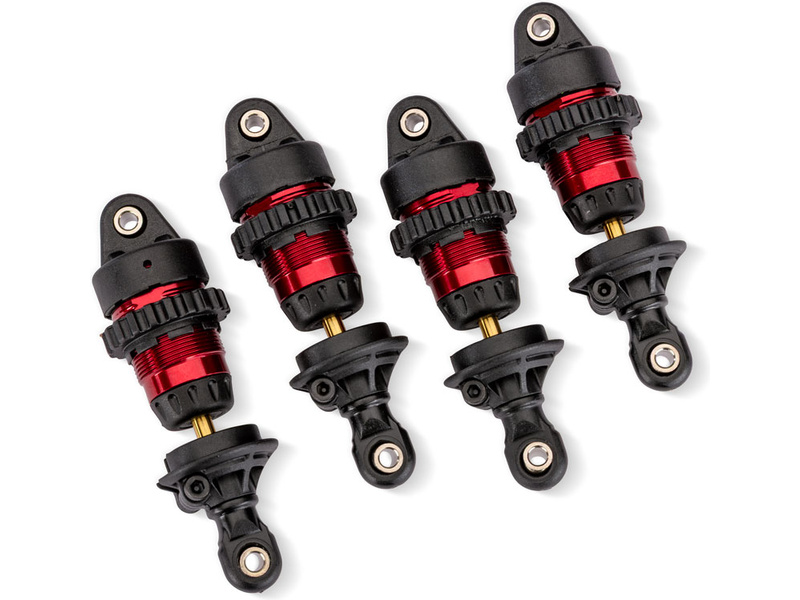 Traxxas tlumič Mini GTR hliníkový červený (4) (4) včetně pružiny (4). Vyrobeno z odolného eloxovaného hliníku. Matice pro snadné nastavení předpětí pružin. Tělo potaženo PTFE (teflonem) pro dlouhotrvající a ultra plynulý tlumící výkon. Pístnice z kalené oceli má povrch povlakovaný nitridem titanu pro tvrdost, otěruvzdornost a snížení tření. Těsnící X-kroužky.