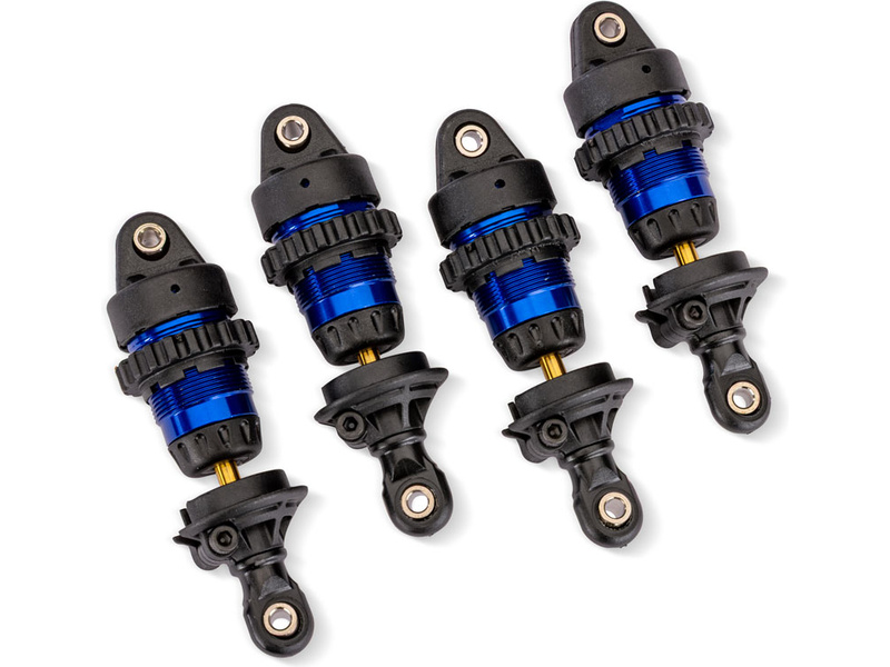 Traxxas tlumič Mini GTR hliníkový modrý (4) včetně pružiny (4). Vyrobeno z odolného eloxovaného hliníku. Matice pro snadné nastavení předpětí pružin. Tělo potaženo PTFE (teflonem) pro dlouhotrvající a ultra plynulý tlumící výkon. Pístnice z kalené oceli má povrch povlakovaný nitridem titanu pro tvrdost, otěruvzdornost a snížení tření. Těsnící X-kroužky.