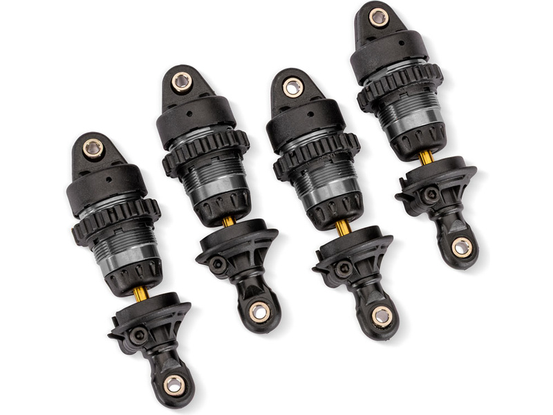 Traxxas tlumič Mini GTR hliníkový šedý (4) (4) včetně pružiny (4). Vyrobeno z odolného eloxovaného hliníku. Matice pro snadné nastavení předpětí pružin. Tělo potaženo PTFE (teflonem) pro dlouhotrvající a ultra plynulý tlumící výkon. Pístnice z kalené oceli má povrch povlakovaný nitridem titanu pro tvrdost, otěruvzdornost a snížení tření. Těsnící X-kroužky.