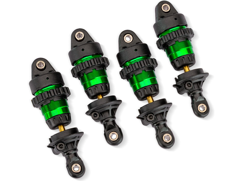 Traxxas tlumič Mini GTR hliníkový zelený (4) (4) včetně pružiny (4). Vyrobeno z odolného eloxovaného hliníku. Matice pro snadné nastavení předpětí pružin. Tělo potaženo PTFE (teflonem) pro dlouhotrvající a ultra plynulý tlumící výkon. Pístnice z kalené oceli má povrch povlakovaný nitridem titanu pro tvrdost, otěruvzdornost a snížení tření. Těsnící X-kroužky.