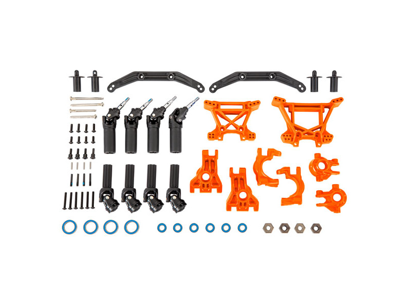 Tuningová sada zavěšení Extreme Heavy Duty - oranžová, pro vysoké zatížení. Upgradujte exponované části vašeho modelu Hoss 4x4, Slash 4x4 nebo Rustler 4x4. Jednotlivé díly sady jsou vyrobeny z odolných materiálů.