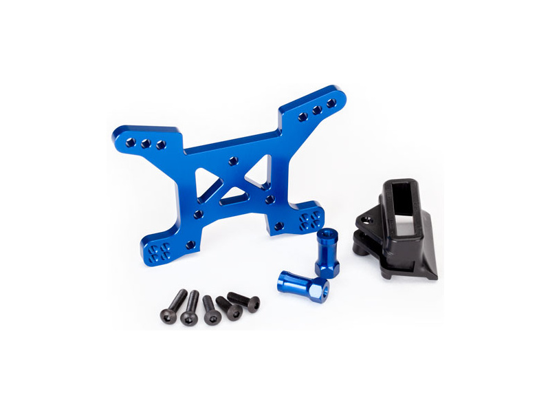 Náhradní díl pro RC model auta Traxxas Rustler 4WD: věž předních tlumičů modře eloxovaná, z velmi pevného hliníku 7075-T6. Včetně držáku karoserie.