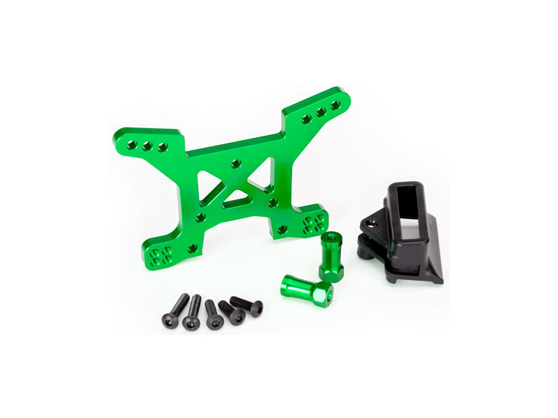 Náhradní díl pro RC model auta Traxxas Rustler 4WD: věž předních tlumičů zeleně eloxovaná, z velmi pevného hliníku 7075-T6. Včetně držáku karoserie.