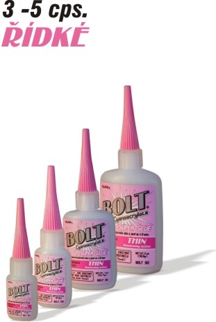 BOLT THIN™ - Nízkoviskózní Ethyl Cyanoacrylate. BOLT THIN™ - Řídké Ca lepidlo určené pro lepení materiálů přesně lícujících na sebe s maximální vůlí 0,05mm. Doba vytvrzení 1-3 sec. Ideální pro lepení kapilárních spojů - Excelentní penetrační schopnost. Ideální pro lepení systémem “složit a zakápnout. Lepí sklo, kov, pryž, dřevo, umělé hmoty apod. Nelepí teflon a podobné materiály. Lahvičky s lepidlem jsou naplněny ochrannou atmosférou pro zajištění maximální životnosti. Lepidla jsou vybavena specielními aplikátory, které eliminují zasychání během používání.