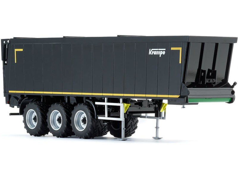 Třínápravový návěs Krampe SB II 30/1070 - černý, v měřítku 1:32. - příslušenství pro kovové modely tahačů Wiking 1:32. Obsahuje funkční odpružení kol se zatáčecí zadní nápravou, zdvihací nápravu, otevírací čelo s otvorem pro jemné dávkování, výsuvné stojky, gumová kola a klíny kol. Na levé straně je otevírací schránka pro nářadí. Kvalitní zpracování z kovu a plastu.