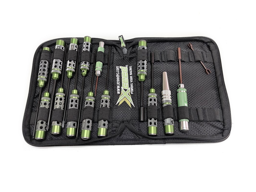 Vysoce kvalitní sada nářadí Xceed zabalená s taškou na nářadí Xceed se zipem. Vysoce kvalitní taška na nářadí s úchyty pro všechno nářadí typu HSS a pěknou výšivkou loga včetně malé kapsy na jmenovku/vizitku. Ideální pro odvedení kvalitní páce na svém podvozku jak doma při přípravách na závody nebo přímo na závodní trati. XCEED je přehledně uklizen a také chráněn při manipulaci mezi domovem a závody.