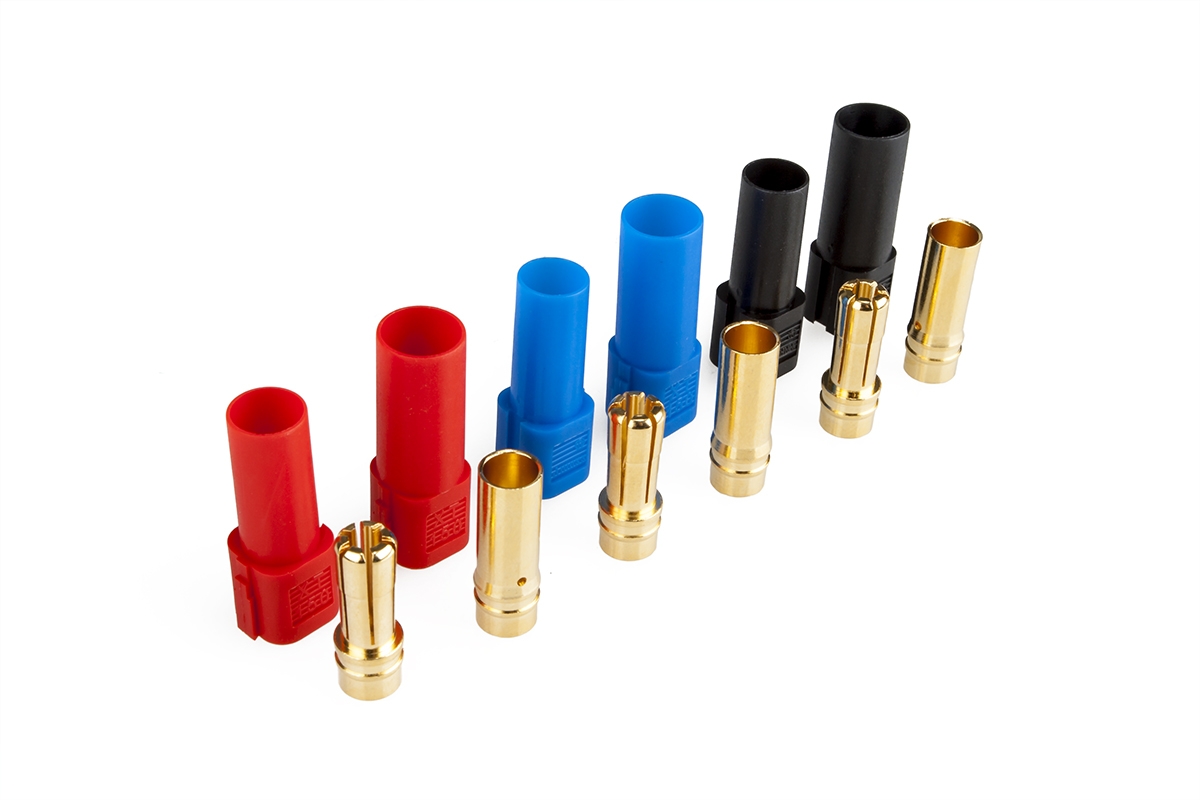 Silový konektor se 6 mm zlacenými kontakty se zatížitelností max. 100 A. Pro kabely o průřezu max. 8,4 mm2 (8AWG). Přechodový odpor 0,20 mOhm, max. 500 V. Balení 3 páry kontaktů s pouzdry v barvě červené, černé a modré.