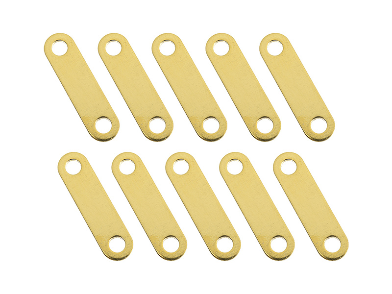 Zlacené pájecí spojky článků baterií. Délka 25 mm, šířka 6.5 mm, tloušťka 1.0 mm. Průměr otvorů 3.0 mm, rozteč otvorů na střed 18.5 mm.