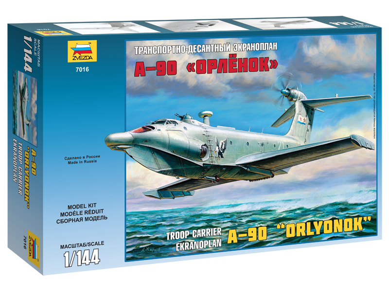 Plastikový model Zvezda 7016 - ekranoplan A-90 "Orlyonok" v měřítku 1:144 ke slepení. Stavebnice obsahuje 38 dílků, délka 401 mm, obtížnost 3.