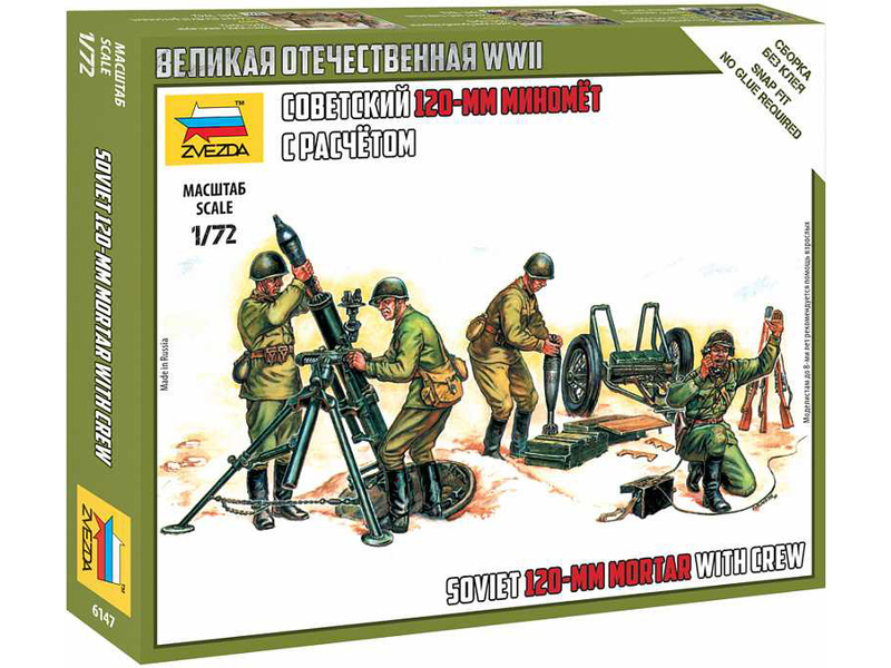 Plastikový model Zvezda 6147 - Sovětská 120 mm Mortar w/Crew v měřítku 1:72. Stavebnice obsahuje 25 dílků, výška figurky 24 mm, obtížnost 2. Ideální pro doplnění plastikových modelů či diorámat.