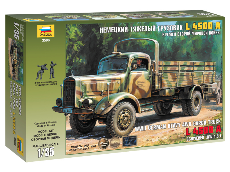 Plastikový model Zvezda 3596 - německý těžký nákladní automobil L 4500A v měřítku 1:35 ke slepení. Stavebnice obsahuje 256 dílků, délka 220 mm.