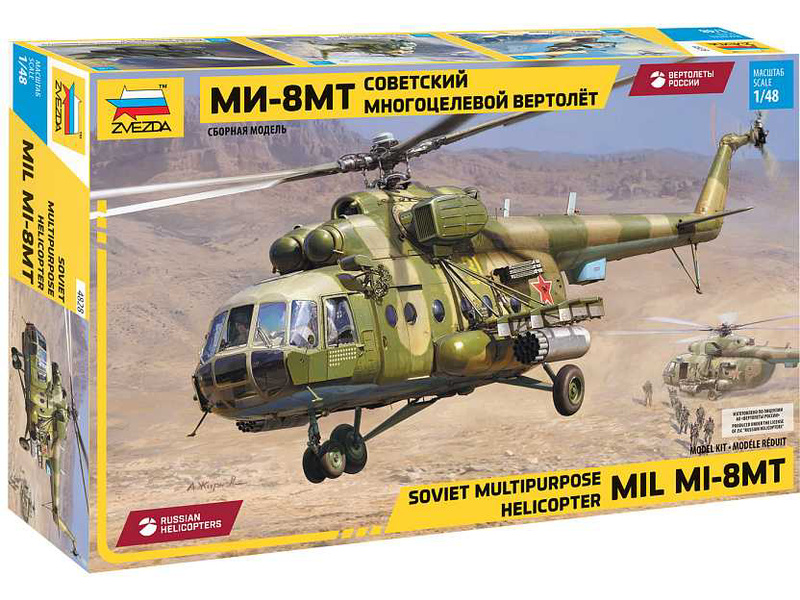 Zvezda plastikový model víceúčelového útočného vrtulník MIL Mi-8MT v měřítku 1:48 ke slepení. Stavebnice obsahuje 354 dílků, délka 527 mm.