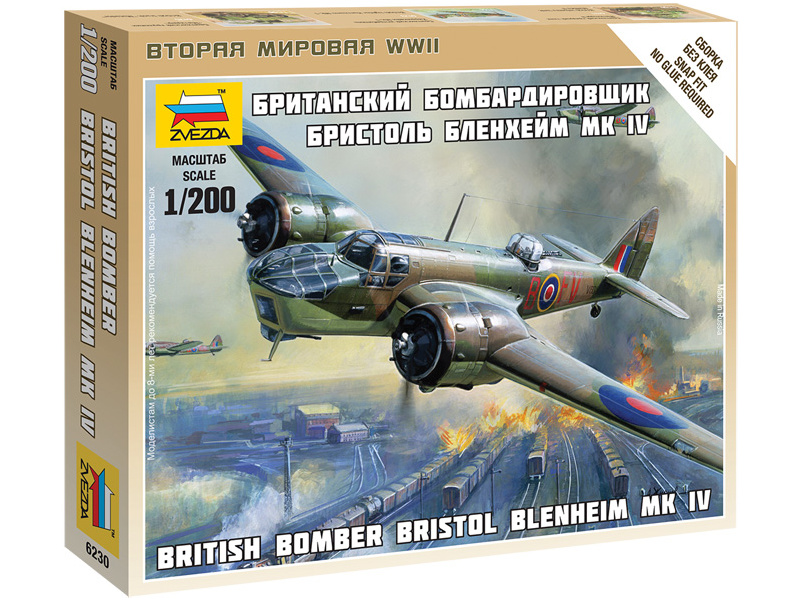Plastikový model Zvezda 6230 – britský bombardér Bristol Blenheim IV v měřítku 1:200. Stavebnice obsahuje 20 dílků, délka 65 mm, obtížnost 3.