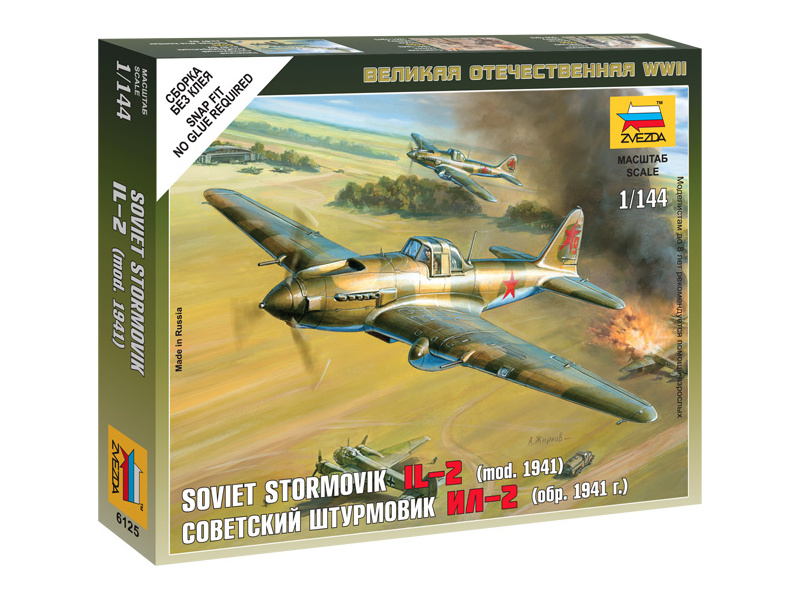 Plastikový model Zvezda 6125 – letadlo Iljušin IL-2 Stormovik v měřítku 1:144. Stavebnice obsahuje 12 dílků, délka 80 mm, obtížnost 2.