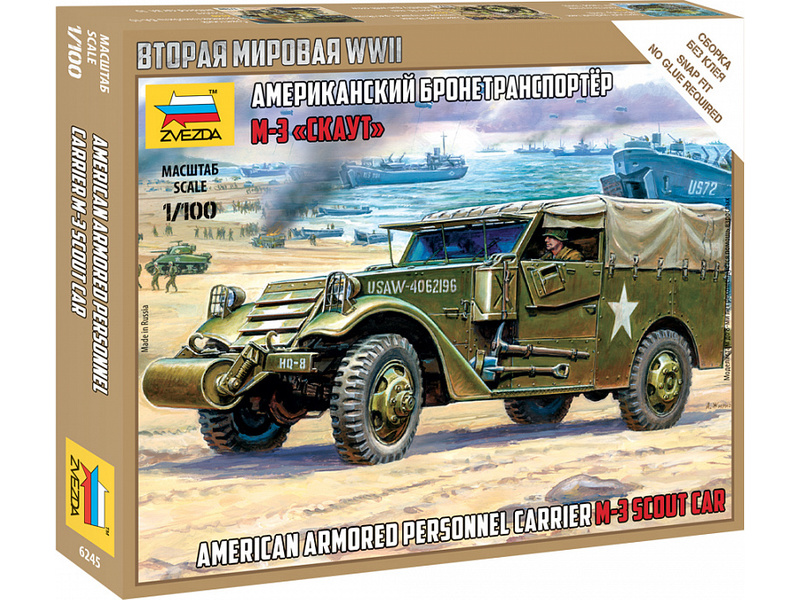 Plastikový model Zvezda 6245 – americké obrněné vozidlo M3 Scout Car v měřítku 1:100. Stavebnice obsahuje 17 dílků, délka 57 mm.