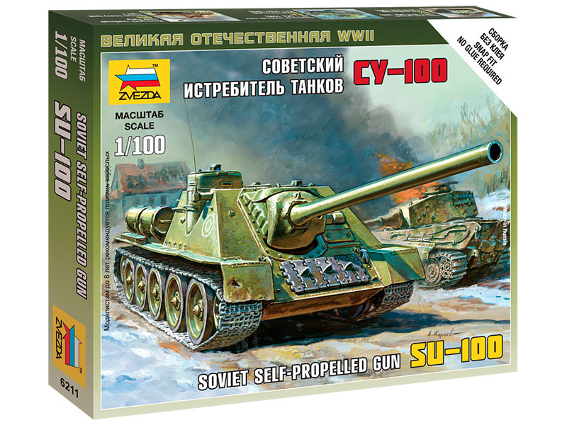 Plastikový model Zvezda 6211 – military SU-100 v měřítku 1:100. Stavebnice obsahuje 15 dílků, délka 95 mm, obtížnost 3.
